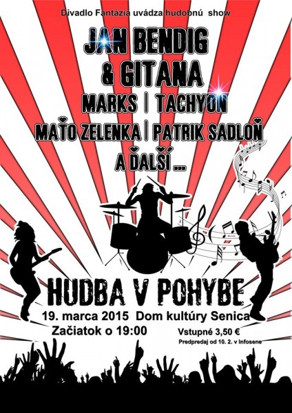 19.03.2015 - Senica, KD, štart: 19:00 - Hudba v pohybe je názov nulteho ročníku koncertu hudobných skupín a sólistov. Bude tu zastúpenie veľa žánrov od jazzu po rock.