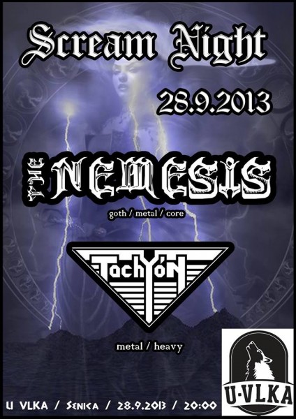 28.9.2013 - Senica, U Vlka; štart 20:00; 1. živé vystúpenie kapely Tachyón, ako pred kapela kapely The Nemesis (http://bandzone.cz/thenemesis)
