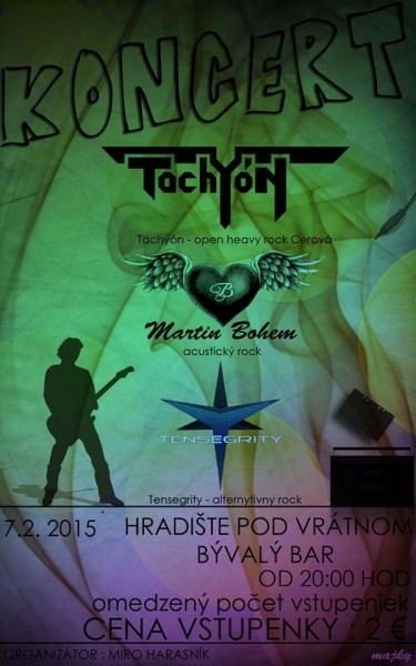 07.02.2015 - Hradište pod Vrátnom, bývalí bar (pri COOP Jednota; štart: 20:00 - Kapela Tachyón poprvé vystúpi v novej zostave a s prerobenými pesničkami. Nenechajte si újsť. Ak ste na nás už boli pozreť, tak toto je nový a lepší TACHYÓN. Ďalej účinkujú Tensegrity a Martin Bohem. Vlezné len v predpredaji u členov kapely Tachyón.