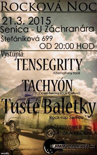 21.03.2015 - Senica, U Záchranára, štart: 20:00 - Keďže v Senici už nie je priestor na koncertovanie, tak sme sa do toho pustili, aby sme rockovú hudbu znovu oživili a dostali naspäť do podnikov. Príďte nás podporiť. Keď akcia vyjde, tak sa koncertík presunie do oveľa väčšieho podniku. Môžete sa tešiť na účinkujúcich Tensegrity, Tusté Baletky a samozrejme my.