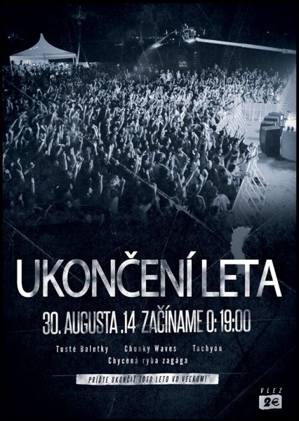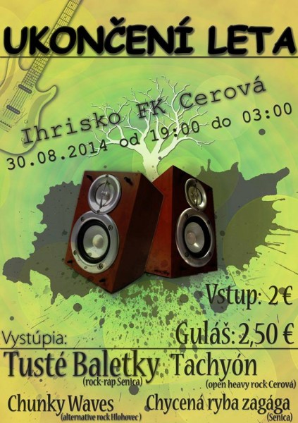 30.08.2014 - Cerová, Ihrisko FK Cerová; štart: 20:00 - 4. živé vystúpenie kapely Tachyón. Účinkujú: Tachyón, Chunky Waves, Chycená Ryba Zagága a Tusté Baletky (www.facebook.com/events/1501643643404865/?ref=ts&fref=ts)